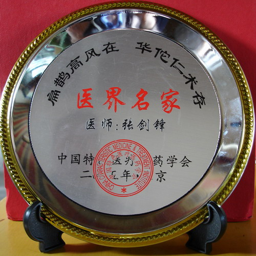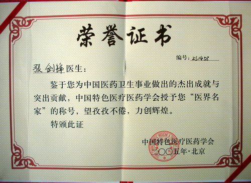 2005年5月,張劍鋒醫師被中國特色醫療醫藥學會聘為終身會員,并授予“醫界名家”的稱號。