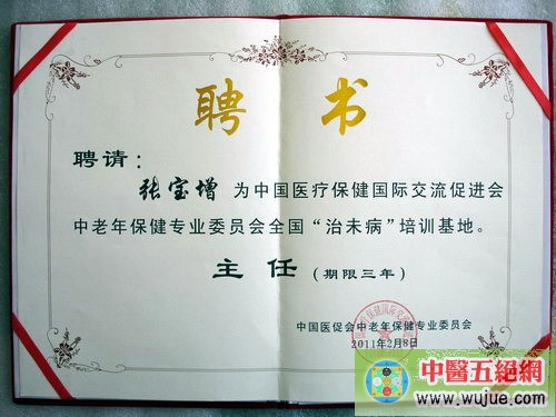 中國(guó)醫(yī)療保健國(guó)際交流促進(jìn)會(huì)中老年保健專業(yè)委員會(huì),聘請(qǐng)涿州市五絕指針療法研究所所長(zhǎng)、五絕指針療法創(chuàng)始人、房樹(shù)村衛(wèi)生室法人張寶增醫(yī)師為:全國(guó)“治未病”培訓(xùn)基地主任,為張寶增醫(yī)師頒發(fā)了聘書(shū)。