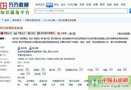 由張寶增、張劍鋒撰寫的“經(jīng)穴區(qū)理論及應(yīng)用”論文入刊2011年《中國中醫(yī)藥咨訊》第19期,并收錄入《中文科技期刊數(shù)據(jù)庫》,并且可在萬方數(shù)據(jù)庫中檢索到論文內(nèi)容。