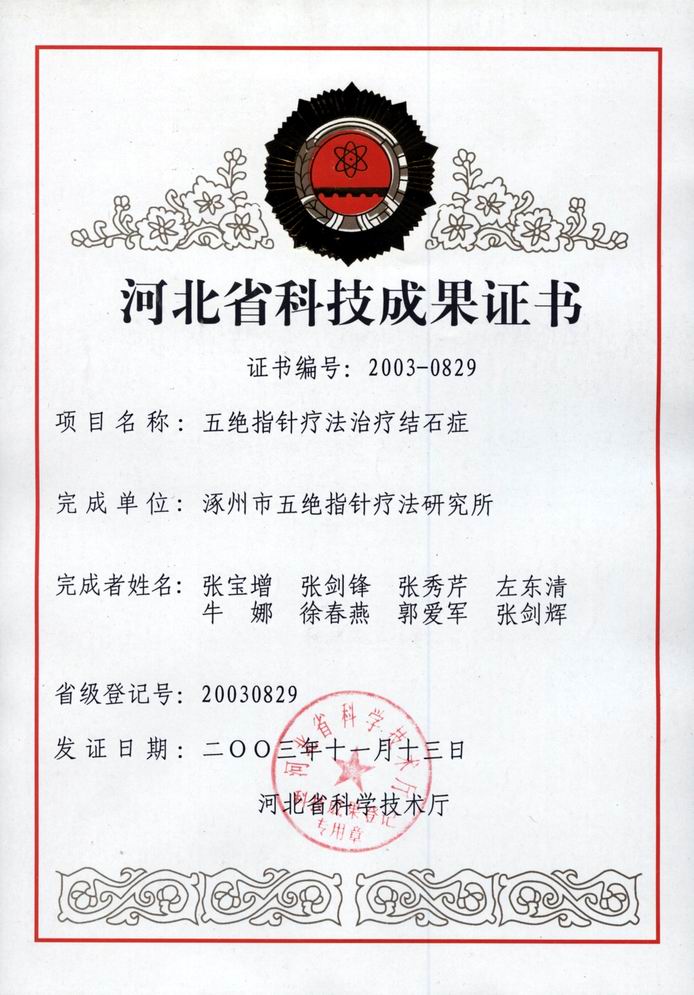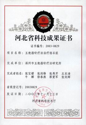五絕指針療法治療結石癥鑒定會技術成果證書