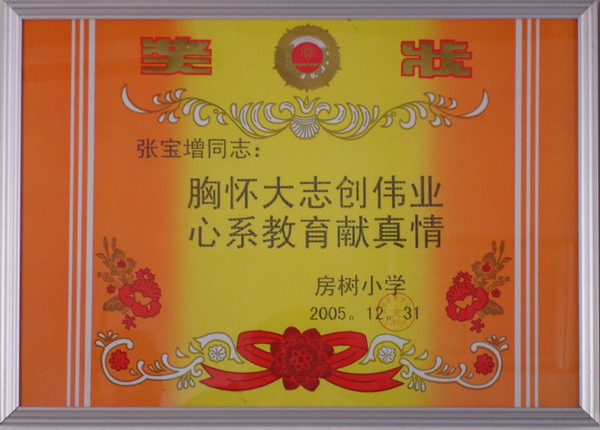 張寶增醫(yī)師在醫(yī)學(xué)上不斷地創(chuàng)新、進取,更熱心于教育事業(yè)的發(fā)展。涿州市松林店鎮(zhèn)房樹中心小學(xué)于2005年12月31日授予張寶增醫(yī)師“胸懷大志創(chuàng)偉業(yè),心系教育獻真情”獎狀。