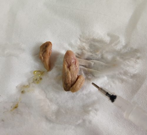 患者楊某,女,56歲。患者于2018年12月24日因突發右側腰腹疼痛,檢查發現“右側輸尿管結石(結石大小約5毫米)伴右腎積水”,并進行碎石治療,輸液一周,未見結石排下。20天來仍有腹脹腹墜及尿少癥狀。2019年1月17日下午采用五絕指針療法治療一次;1月18日,患者尿中排下兩枚大塊肉狀物,大者約15×7毫米,色偏黃,質軟。到醫院復查彩超提示:右側輸尿管結石及腎積水消失,未見異常。