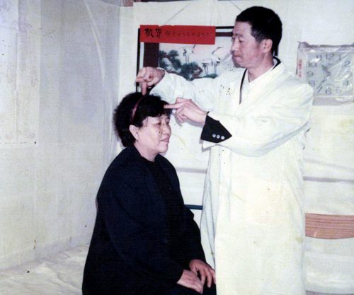 五絕指針療法創(chuàng)始人張寶增正在為一位失眠癥患者治療。